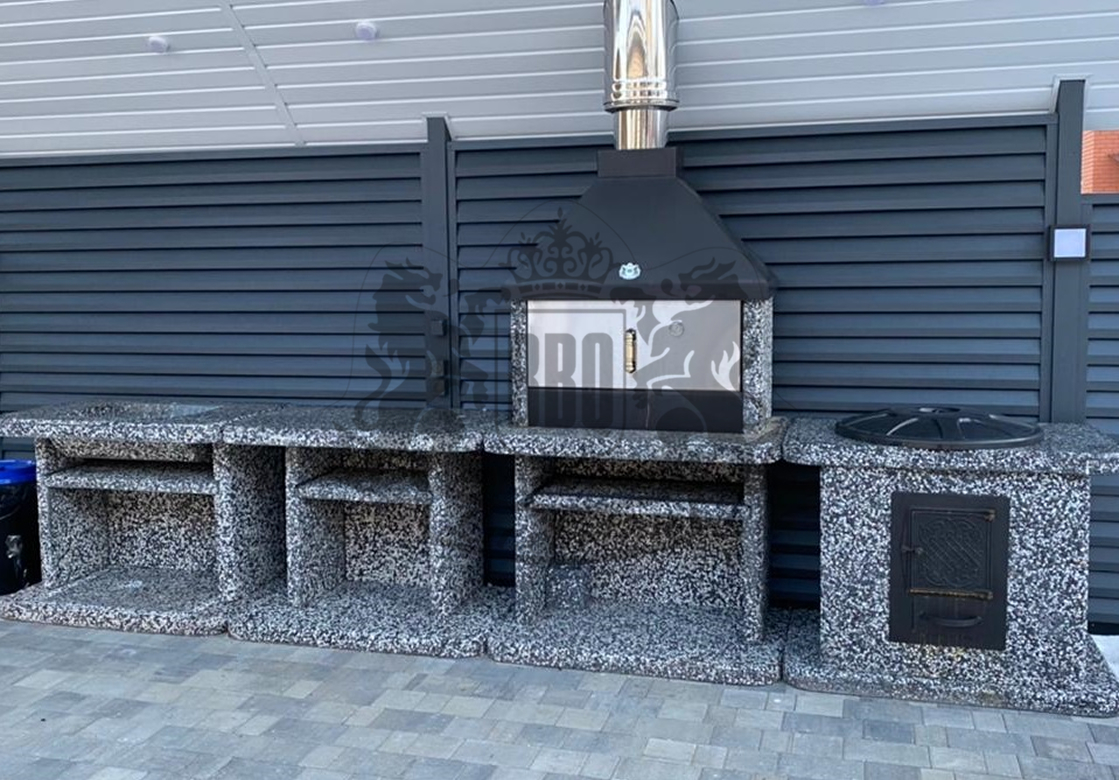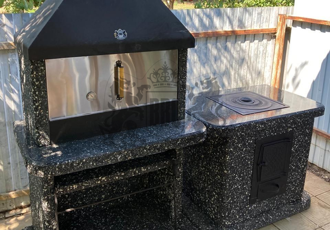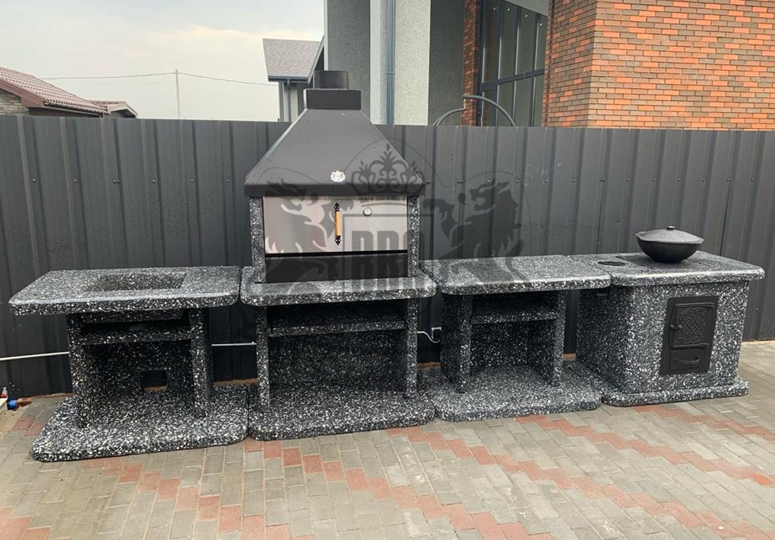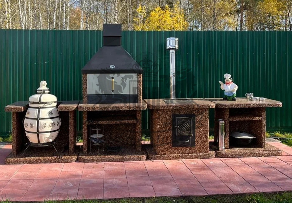 Барбекю-комплекс с русской печкой — это вершина модульной кухни от производителя «ЛюксБетон», сочетающая мангал, печь под казан и главный элемент — русскую печь. Такая конструкция позволяет не только жарить шашлыки, но и запекать, томить блюда, выпекать хлеб, воссоздавая вкус еды из традиционной деревенской печи. Это полноценная уличная кухня, которая заменит вам летнюю кухню или беседку.
