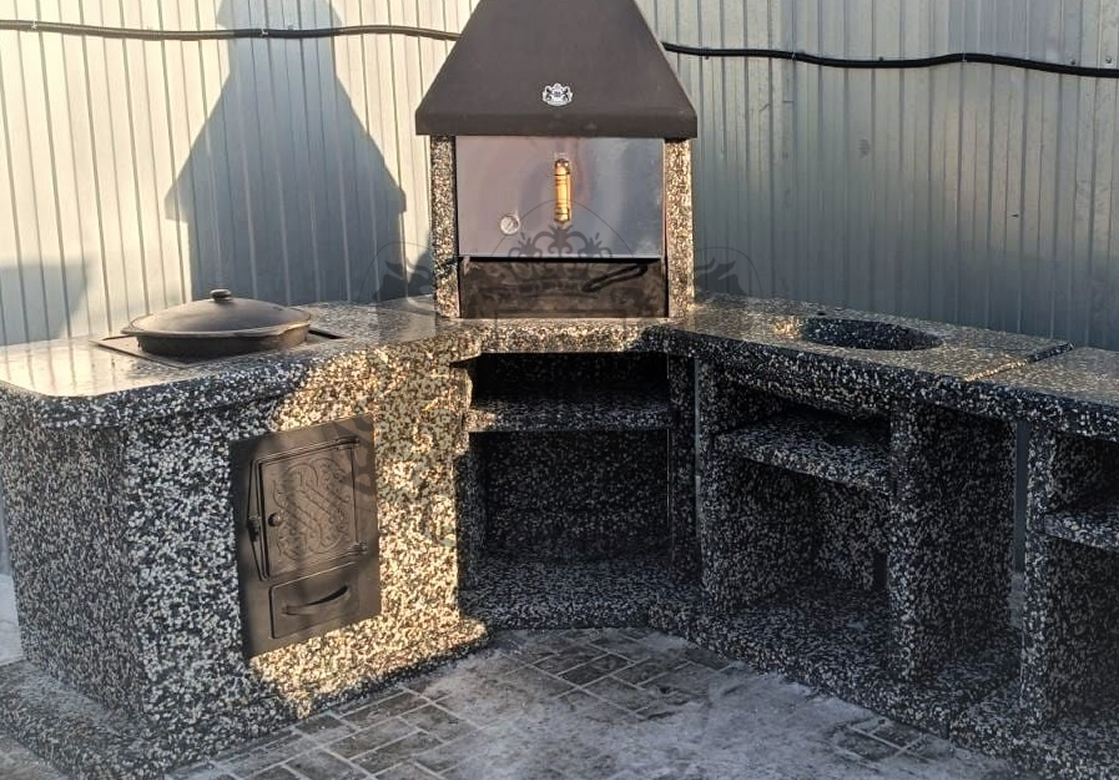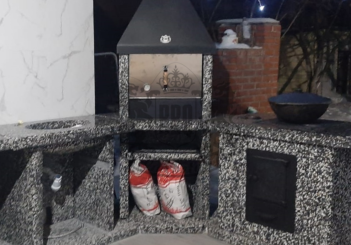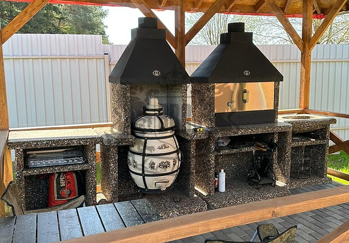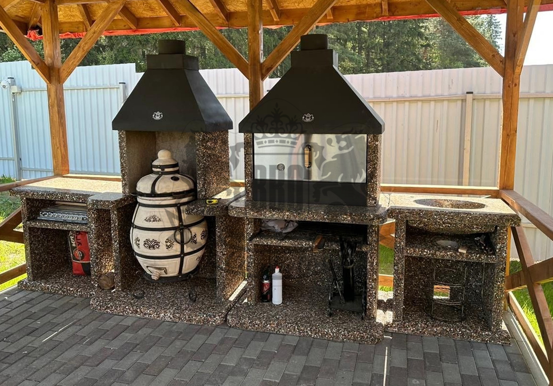 Барбекю-комплекс с русской печкой — это вершина модульной кухни от производителя «ЛюксБетон», сочетающая мангал, печь под казан и главный элемент — русскую печь. Такая конструкция позволяет не только жарить шашлыки, но и запекать, томить блюда, выпекать хлеб, воссоздавая вкус еды из традиционной деревенской печи. Это полноценная уличная кухня, которая заменит вам летнюю кухню или беседку.